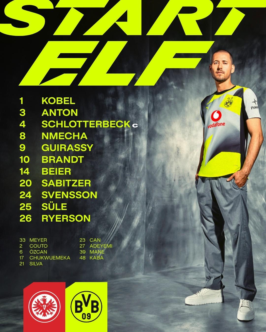 多特首发:1-科贝尔、3-安东、4-施洛特贝克、25-聚勒、26-瑞尔森、8-恩梅加、20-萨比策、10-布兰特、24-斯文松、14-拜尔、9-吉拉西